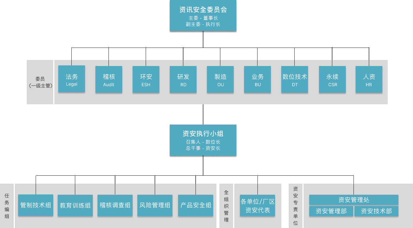 资讯安全委员会为k1体育资安最高管理组织,向董事长报告。下辖资安执行小组负责推行资讯安全委员会之各项决议。为持续建构完整且精实的资安专 责团队,资讯安全管理处下成立「资讯安全管理部」与「资讯安全技术部」,持续投入资源以强化团队资安核心能力。